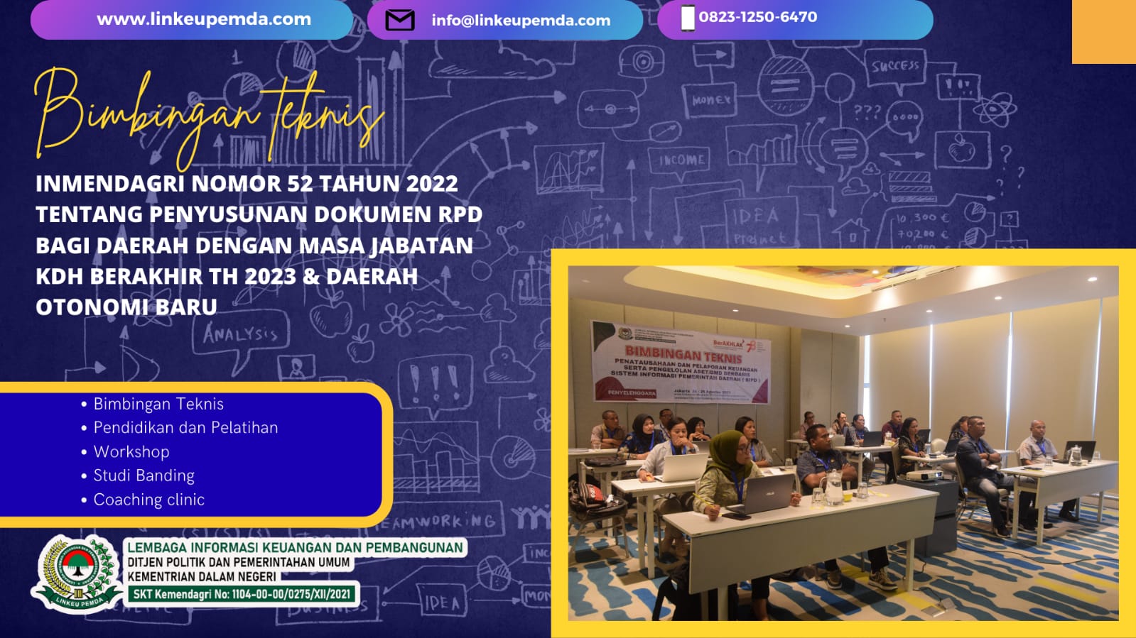 Sehubungan dengan hal tersebut diatas, kami dari Lembaga Informasi Keuangan dan Pembangunan Daerah (LINKEUPEMDA), Selaku penyelenggara kegiatan serta dukungan narasumber yang berkompoten dibidangnya, Mengudang Bapak/Ibu untuk mengikuti kegiatan bimtek nasional dengan Tema : “BIMTEK INMENDAGRI NOMOR 52 TAHUN 2022 TENTANG PENYUSUNAN DOKUMEN RPD BAGI DAERAH DENGAN MASA JABATAN KDH BERAKHIR TH 2023 & DAERAH OTONOMI BARU” untuk informasi lebih lanjut dapat menghubungi: