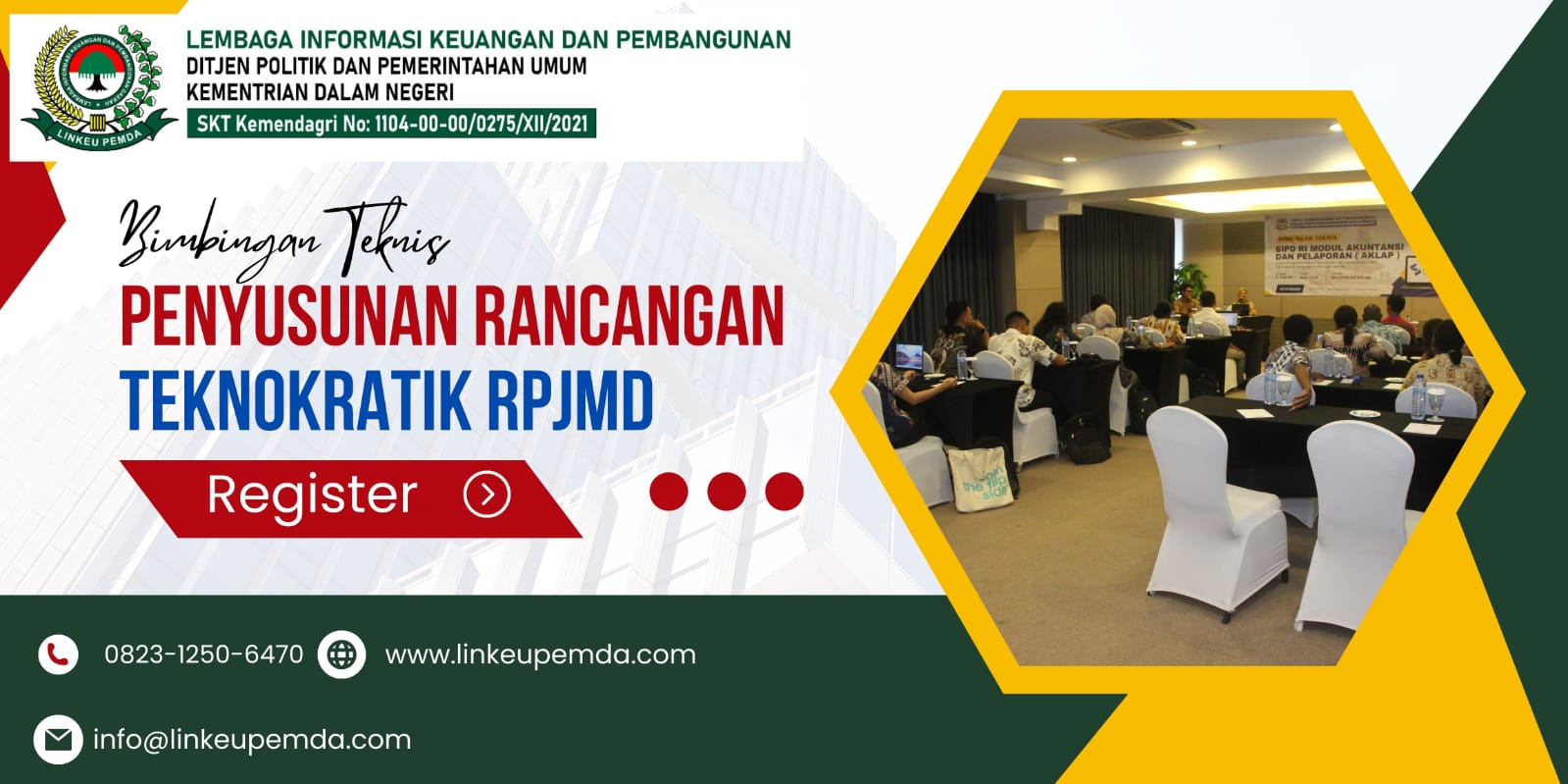 Sehubungan dengan hal tersebut diatas, kami dari Lembaga Informasi Keuangan dan Pembangunan Daerah (LINKEUPEMDA), Selaku penyelenggara kegiatan serta dukungan  narasumber yang berkompoten dibidangnya, Mengudang Bapak/Ibu untuk mengikuti kegiatan bimtek nasional dengan Tema : “Bimbingan Teknis Penyusunan Rancangan Teknokratik RPJMD” untuk informasi lebih lanjut dapat menghubungi: